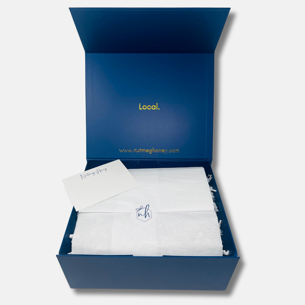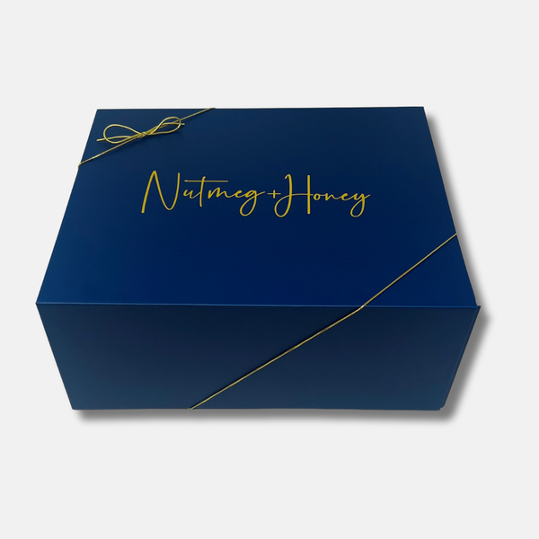 This gift is packaged in our keepsake medium Nutmeg + Honey navy blue box, a modern take on a traditional gift basket. The contents of the box are wrapped in tissue paper. This gift also comes with a handwritten card on Nutmeg + Honey stationery.