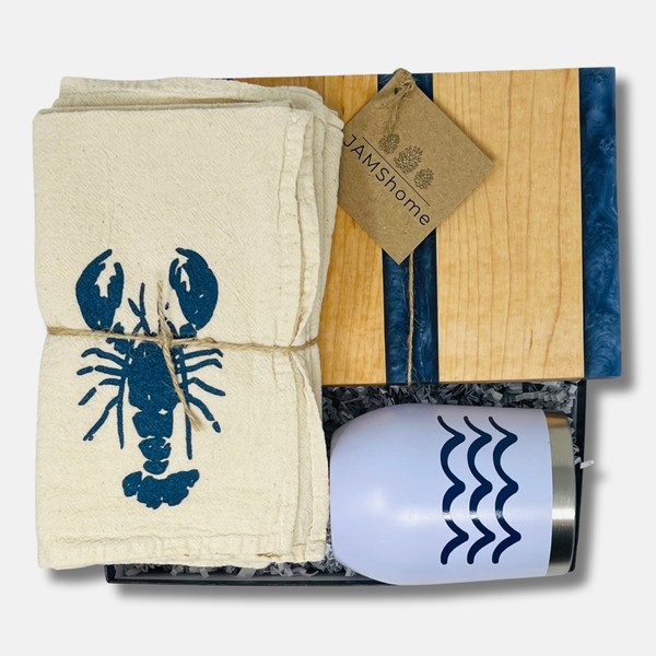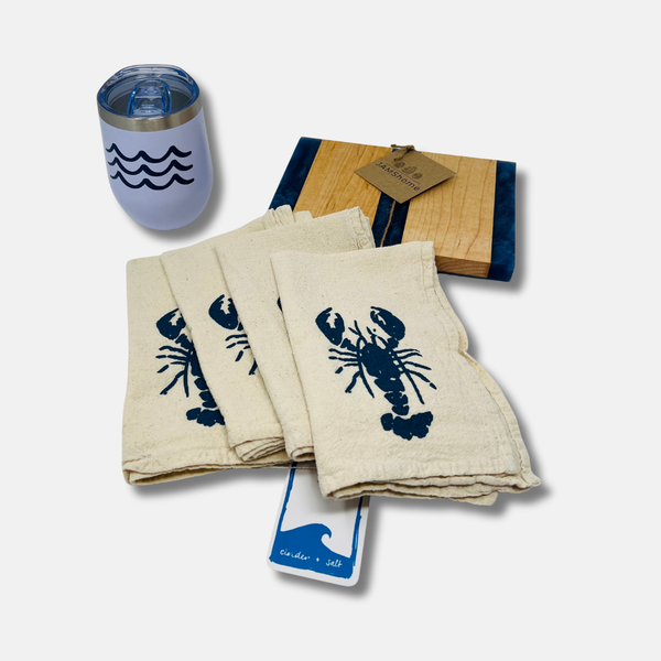 Add some New England style to your home with lobster printed cloth napkins, a handcrafted charcuterie board and ocean inspired tumbler. Perfect as a housewarming or thinking of you gift.
