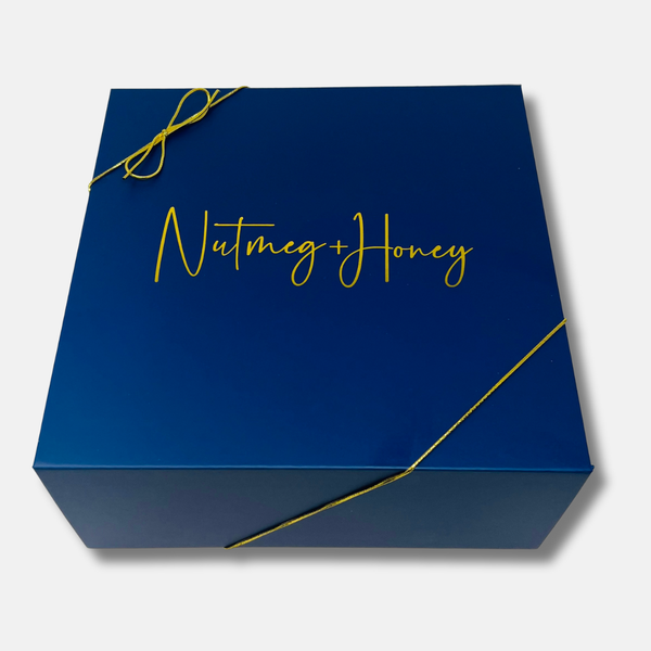 This gift is packaged in our signature 9x9x4 navy blue keepsake box adorned with gold ribbon and a handwritten card on Nutmeg + Honey stationery.